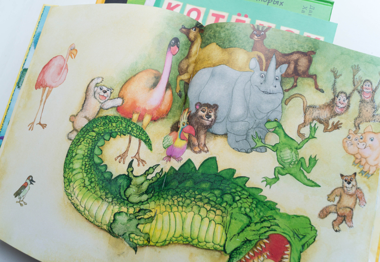 Читали книгу очень много, Заходер по тексту хорош, как, впрочем, и всегда. А Коля книжку читает с канонным еврейским акцентом почему-то: "Я тебе шо скажу, этот къокодил пъямо-таки не находил себе места, ребе!". Сильно смешно выходит. Хотя в ней есть приличный такой минус. Читать, честно говоря, очень сложно. Ибо там есть целые развороты без рисунков, за которыми следуют развороты без текста. Вот так: