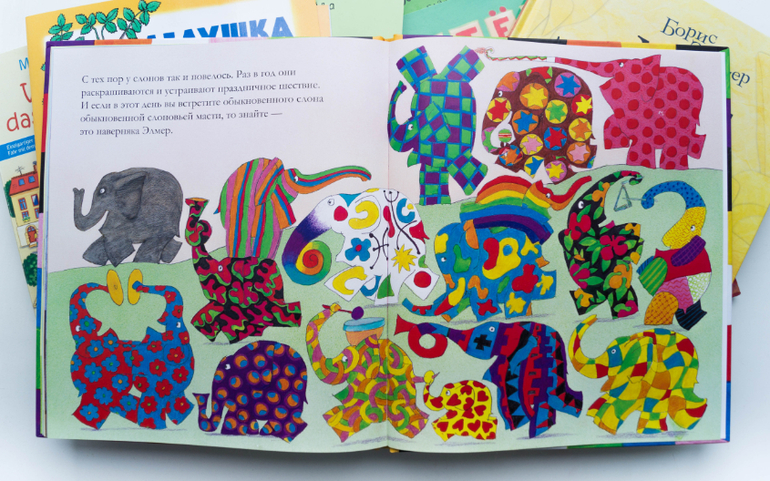 Я всё мечтаю какие-нибудь художества по этой книге устроить. Порисовать слонов, аппликаций наляпать. И вообще, только ленивый ведь не сделал своему ребёнку Элмера из картона-фетра-папье-маше. Но что-то пока нам всё недосуг-недосуг.