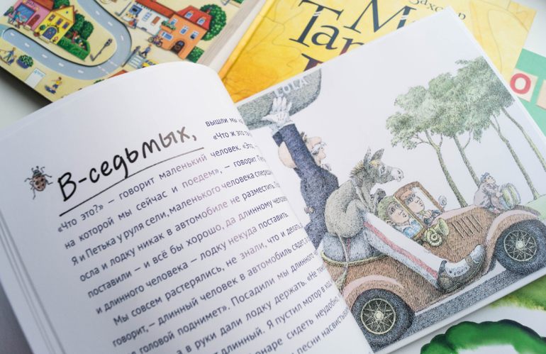А ещё в книге очень здорово обыгрываются размеры. Маленький, большой, длинный. И относительность. Маленький человечек не может удержаться на осле, большой человек не может на него даже сесть. А вот главному герою с Петькой и нормальными человеческими размерами - в самый раз.