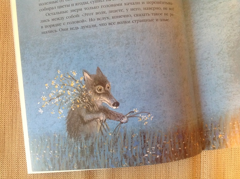 "Правдивая история о добром волке" - давно хотела купить, думаю в библиотеке должна быть хотя бы одна книга, разрушающая стереотипы о злых волках, умных совах, хитрых лисах и т.п. Иллюстрации в книге получились сильнее текста, очень красивые и выразительные.