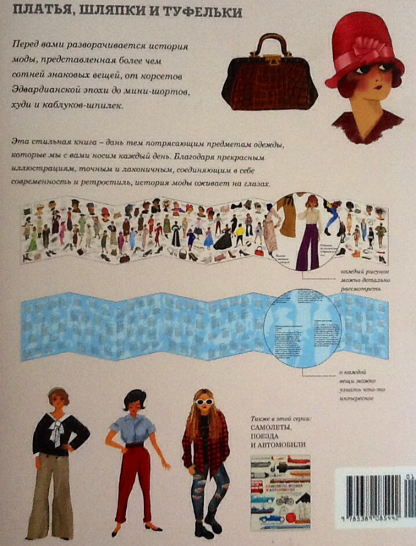 Книга привлекла меня в первую очередь своим необычным форматом. И, естественно, своим содержанием, Книга собрала в себе более 100 моделей костюмов, аксессуаров и обуви, характерные для каждого десятилетия ХХ века. Книга разворачивается в ленту длиной 2 метра. На одной стороне представлены рисунки, а на оборонной стороне - силуэты рисунков и текст.