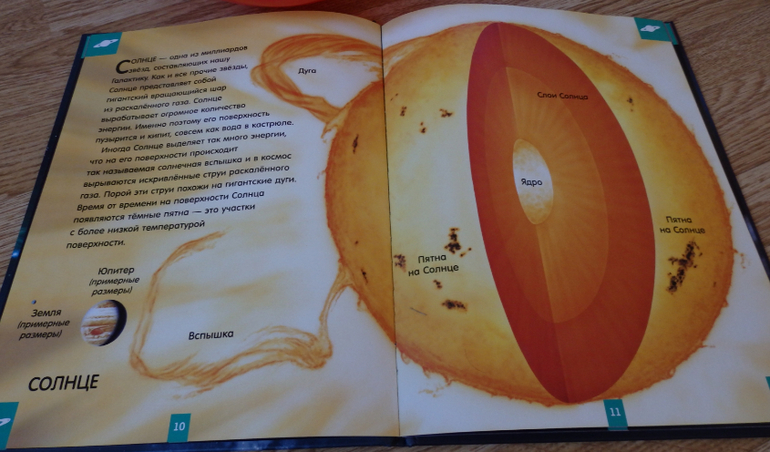 Это любимый разворот Николы. Я уже говорила в первой части поста, что Солнце - единственная вещь, которую он показывает в книге по чужой просьбе :) Там где "ну просто громадные" внутри окошка много-много мелких планет Земля, которых в Солнце поместилось бы более миллиона.