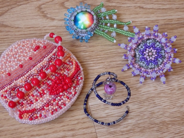 Юпитер она просила давно и настойчиво, даже бисер по книге подбирала. Ладно, вышила я Юпитер... Настя говорит, что незачёт - где его 67 спутников?! Кое-как договорились на сколько-влезет (и то она пыталась всунуть побольше). Так у нас родилась совершенно уникальная заколка - Юпитер и хоровод его спутников. Ох, вы бы слышали с каким наслаждением Настя говорит "ха-ррра-воот"!