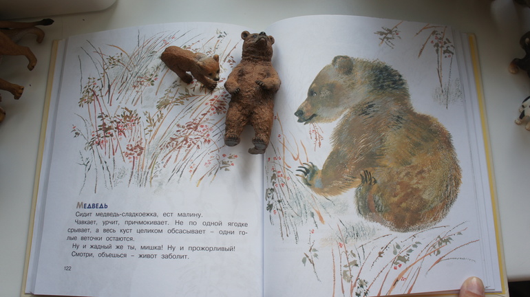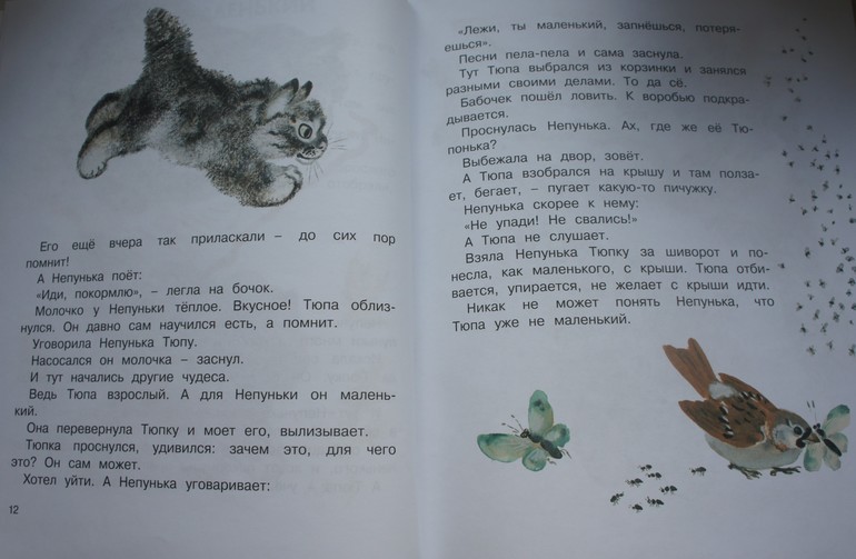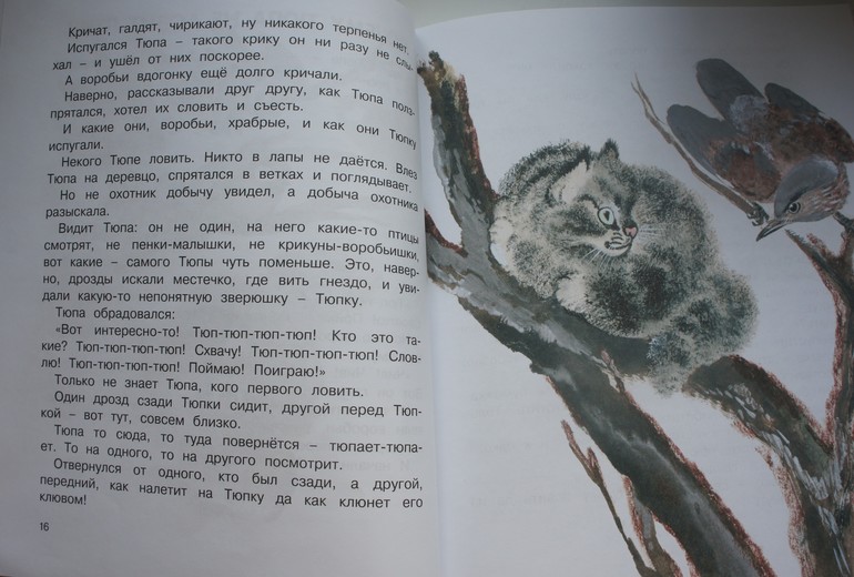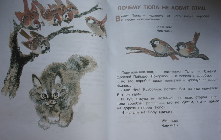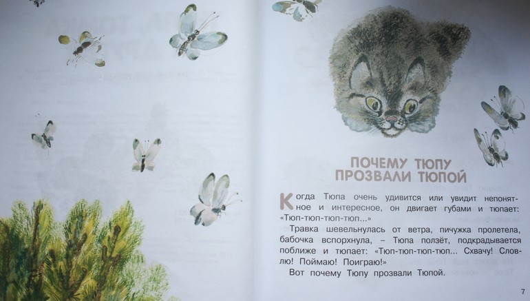 Котенок Тюпа теперь один из ее фаворитов. Тюпает, чивкает (чив-чив) и бесконечно просит читать про Тюпу. Рассказы простые, познавательные, о животных, об их повадках, пристрастиях, навыках. Книга еще хороша, в нашем случае, тем,что дочка любит находить среди наших игрушек персонажей со страниц книги, а тут есть где разгуляться!!!Многие сейчас покупают фигурки животных, так вот иллюстрации, они, к слову сделаны самим автором, крупные, перонаж о котором ведется повествание предстает перед нами во всей красе!