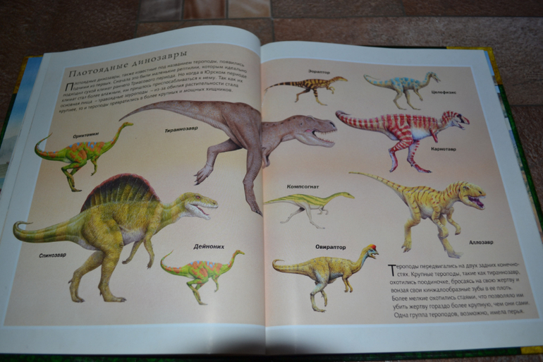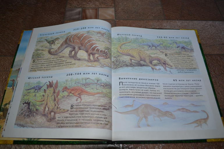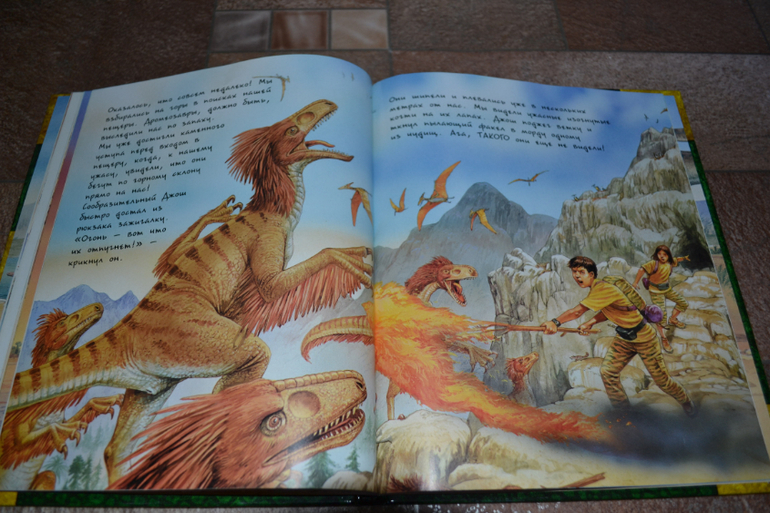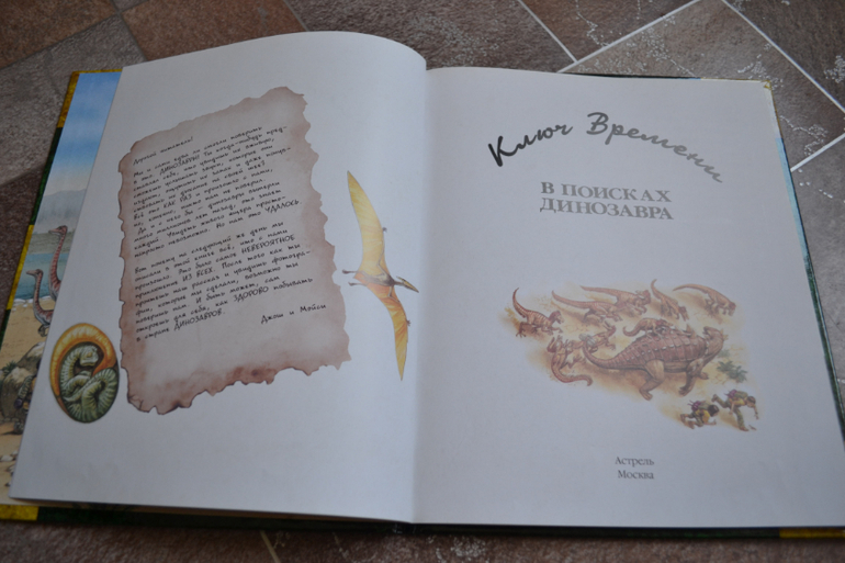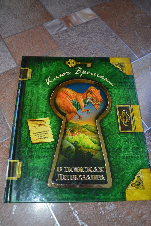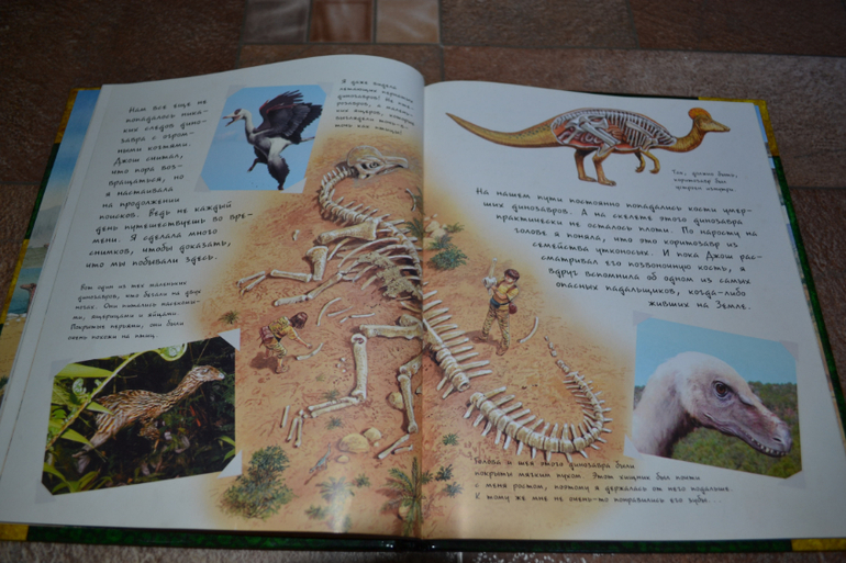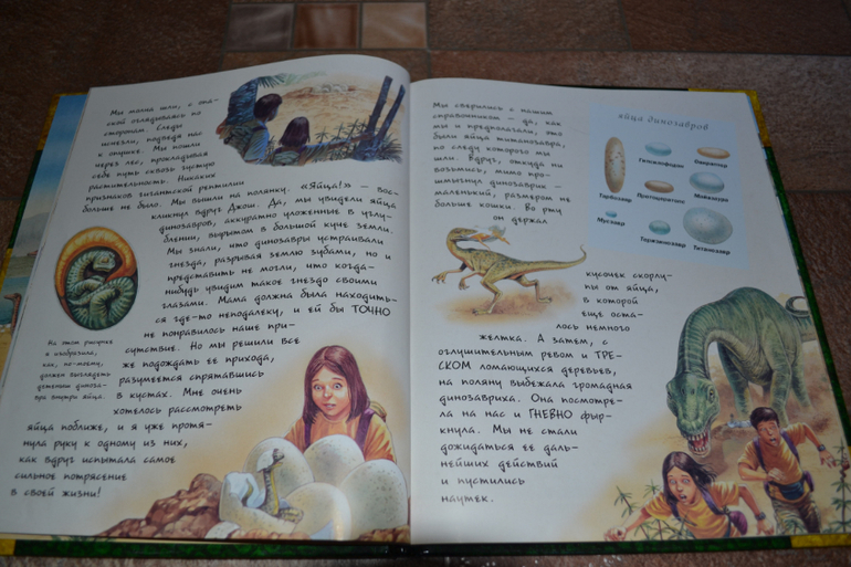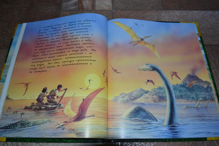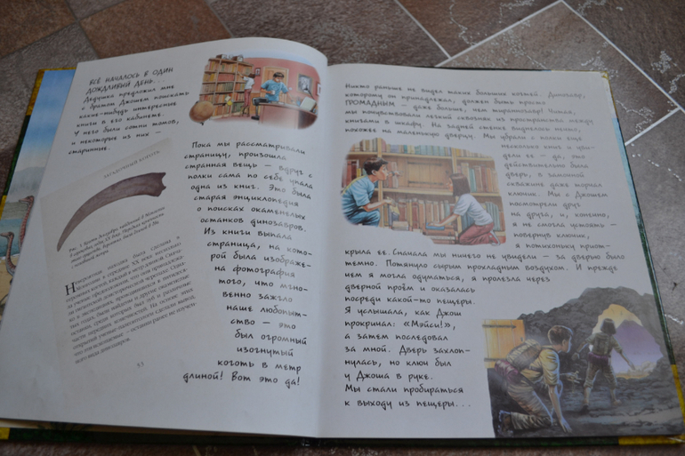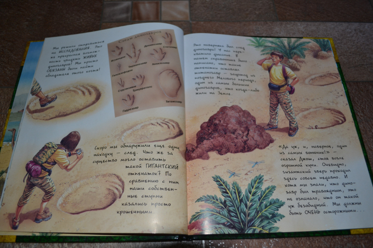 Посмотреть развороты в лабиринте и почитать отзывы я даже как-то и не подумала, т. к. заказывала через май шоп.Доверилась единственному отзыву и не прогадала!Книга просто чудесная во всех отношениях!Правда жаль, что май шоп прислал её с порванным корешком((( Вдвойне обидно и-за того, что эта книга не из тех, которые прочитаешь раз и уберёшь на полку - эта книга последние 1,5 недели вообще не убирается на полку!А если убирается, то сразу достаётся сыном обратно))) Честно скажу, когда заказывала, думала, что она нам на вырост.Может и на небольшой, но всё же на вырост.Оказалось, что нет - читать стали в 3,1 г. сразу!Может потому, что Дима уже многое знал о динозаврах, а может просто так легко и увлекательно написана))) Конечно развороты с энциклопедическими справками мы не читали (только разглядывали иллюстрации), а вот саму историю перечитали уже много раз!Повествование идёт от первого лица - от одного (а точнее одной) из двух подростков, чудесным образом оказавшихся в мире динозавров.А началось всё с того, что им в руки случайно попала книга о динозаврах, и они обратили внимание на коготь таинственного животного, который по описаниям был небывалых размеров.Обладателя этого когтя они и отправились искать в такой интересный, но полный опасностей мир))) Автор прикладывает "фотографии", карты и прочие доказательства того, что всё это произошло на самом деле.И я допускаю, что ребёнок вполне может в это поверить))) Единственный недостаток, на мой взгляд, это шрифт, стилизованный под почерк автора, но трудночитаемый даже взрослым человеком.Ну, а смогли ли дети найти обладателя когтя и вернуться домой, вы узнаете, прочтя книгу))) К счастью, стОит она совсем недорого, и я бы даже сказала, что совсем дёшево, если сравнивать с тем количеством удовольствия и радости, которые она привнесла в наш с сыном досуг)))