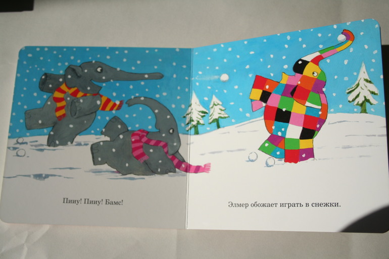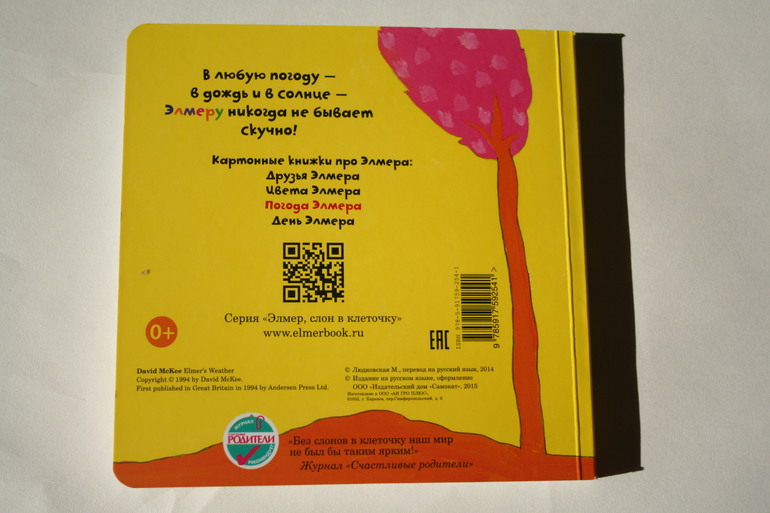 для самых маленькихПогода Элмера - новинка Самоката. Небольшая квадратная книга с плотными картонными листами легко уместится в руках у ребенка и станет его любимой первой книжкой. Ведь яркие и незабываемые иллюстрации, умело созданные известным во всем мире писателем и иллюстратором Дэвидом Макки, невозможно не полюбить. Мои малыши с удовольствием рассматривают книгу и вместе со мной обсуждают перемену погоды и ее особенности. В картонной серии вышло еще три книги про друзей Элмера, любимые цвета и распорядок дня. Мы собрали всю коллекцию картонных книжек и ждем продолжение.