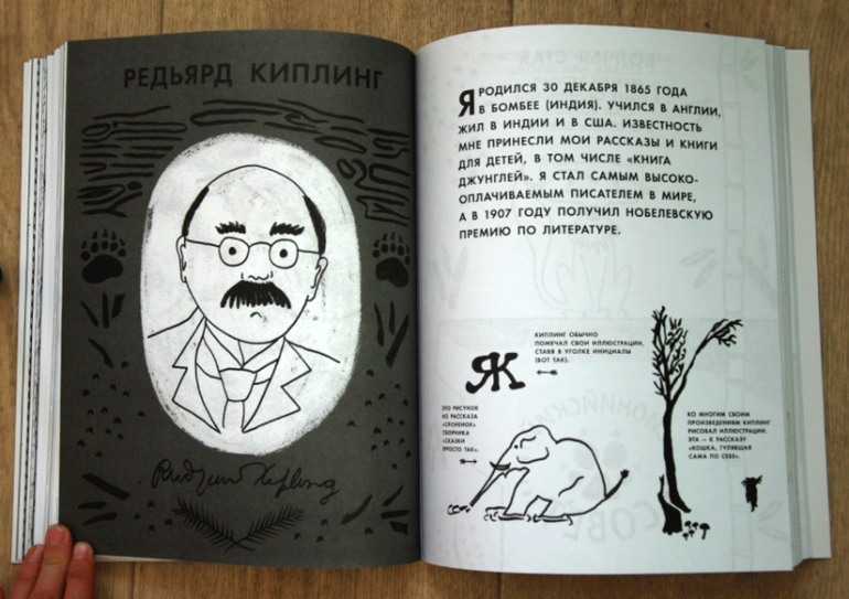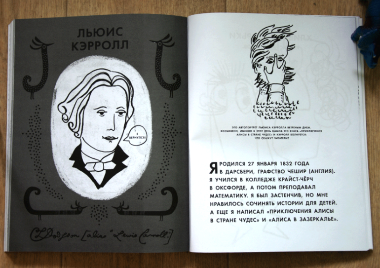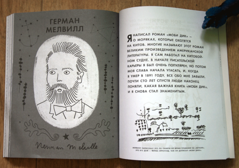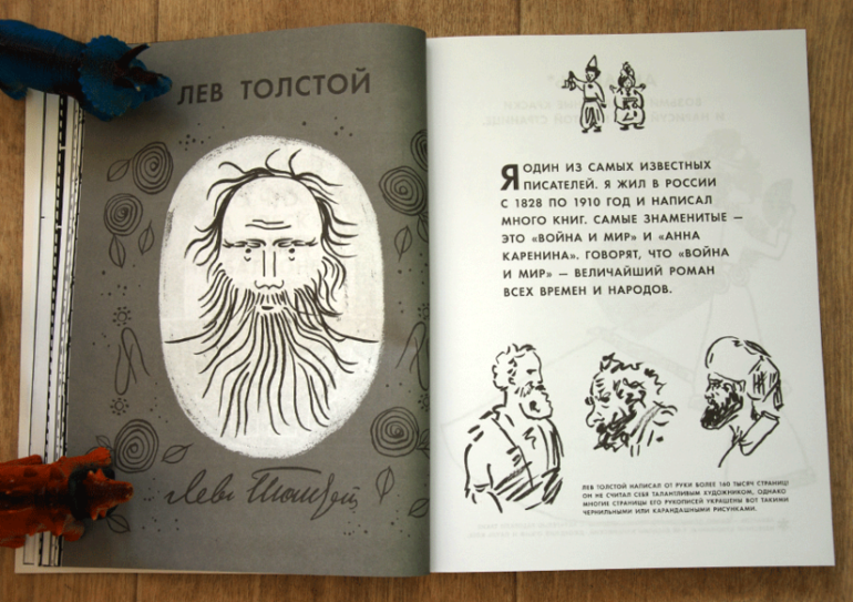На каждого писателя в тетради отводится 11 разворотов. Сначала идёт 1 разворот с портретом писателя, интересной информацией о нем и его произведениях, дудлами, которые он рисовал на страницах своих рукописей. Затем 10 разворотов с творческими заданиями, на которых есть также познавательная информация. Информация о писателях дана в очень лёгкой и доступной форме, что очень заинтересовывает к прочтению их биографии и произведений.