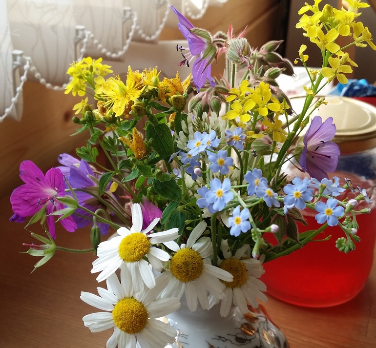 Крапиву Ксюша наотрез отказалась фотографировать (видимо сказалось недавнее окрапивливание при поисках улиток), а лесную герань мы поместили в наш букетик в начале поста.