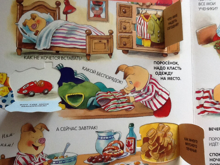 Книжка из плотного картона, с пухлой обложкой и достаточно прочными окошками. Для малышей в самый раз! Ребенок с удовольствием и большим интересом открывает каждое окошко и называет предметы, спрятанные в них. Помимо окошек, книга носит образовательный характер. В игровой форме можно познакомить ребенка с цветами и формами, счетом и цифрами, а так же различными понятиями и определениями. В книжке есть странички, посвященные теме хороших манер и правильному поведению. Что можно делать и чего делать нельзя на улицах города. А так же как вести себя в супермаркете и на детской площадке.