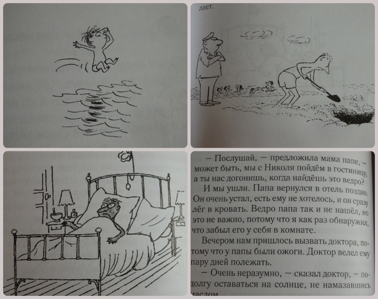 Плюсом в этой книге стало то, что интересное (для Настика) началось сразу же, первая история, которую мы прочитали была "Пляж - это здорово!" А пляж - это действительно тогда было очень здорово! И про ямы (Настя, кстати, долго возмущалась, что дядя такой заполошный, не понимает абсолютную привлекательность настоящей ямы и полную её безопасность). И про обгорание (у нас никто не обгорел), здесь ребёнка возмутила невнимательность Николя и мамы по отношению к папе - они же нашли ведро в номере, а папа так и искал его на пляже ("прямо ай-яй-яй!!!")