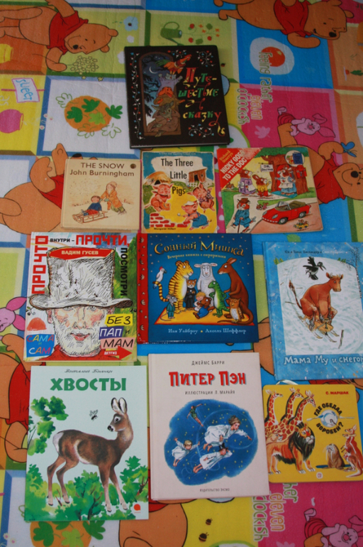 и три англоязычные: "Снег" и "Три поросенка" - совсем малышковые, Скарри про поход на осмотр к доктору (для профилактики ора во время диспансеризаций)))