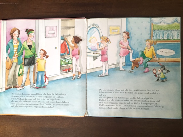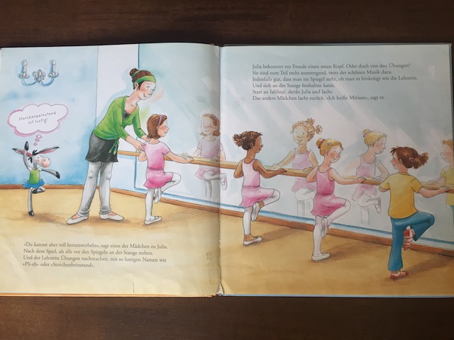 "Сегодня идем в балетную школу" выбрал Насте четырехлетний мальчик в библиотеке. Она подошла к нему познакомиться, а он поболтал с ней немножко, покопался на стеллажах и протянул ей эту книжку. Очень удачный оказался выбор, тема у дочки любимая. Читали тоже пару раз, но картинки она рассматривала часто.