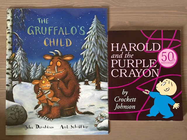 Эти две книжки стали хитами последней недели июня. Удивительно, но Настю совершенно не беспокоит, что читаем мы по-английски. Нежно любит Груффало, теперь полюбила и его дочурку. Перечитали раз сто. Мне самой книжка очень понравилась. "Груффало" у нас на толстенном картоне, но формат маленький. А здесь бумажные странички, формат А4 и иллюстрации выглядят намного эффектнее. "Гарольд" пользовался не меньшим успехом, правда, Настя пару раз просила прочитать ей эту книжку на русском. Я от книжки в восторге, настолько она проста и в этой простоте гениальна. У нас на даче хранится фиолетовый мелок и мы часто теперь рисуем им разные истории.