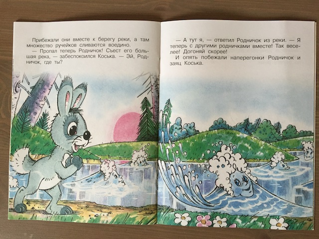 "Заяц Коська и родничок" из серии Мультсказки я достала после того, как в России Настя с удовольствием слушала некоторые рассказы Грибачева почти без иллюстраций. Здесь картинки очень милые и проиллюстрирован каждый поворот сюжета. Неудивительно, что доче очень понравилось.