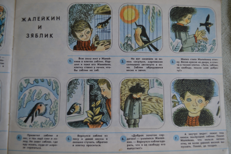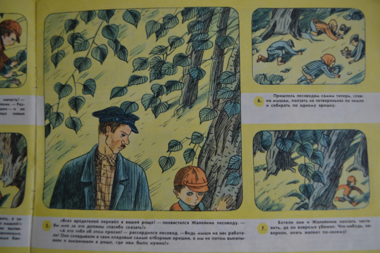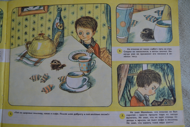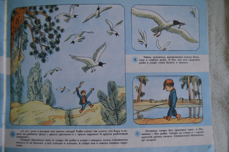 Книжка-картинка. Художник Г. Ясинский. Всего 11 историй на 1-2 страницы. Все истории нравоучительные, но без занудства. Вообще впечатлена, как автору совместо с художником удалось вот так буквально в двух-трех картинках обрисовать сюжет и тут же вывести мораль - не прогоняй дятлов, не корми птенцов конфетами и т.д. Повествование вышло безусловно полезным и откровенно понятным детям.