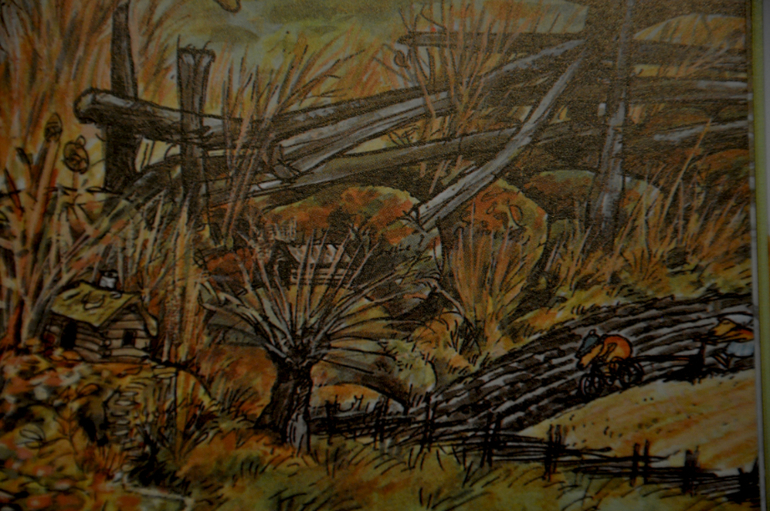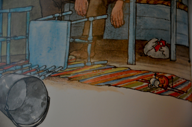 Курица, выглядывающая из картины? Да нет, там тайный вход - из курятника) Топоры, вернее ручки, тоже забавные))