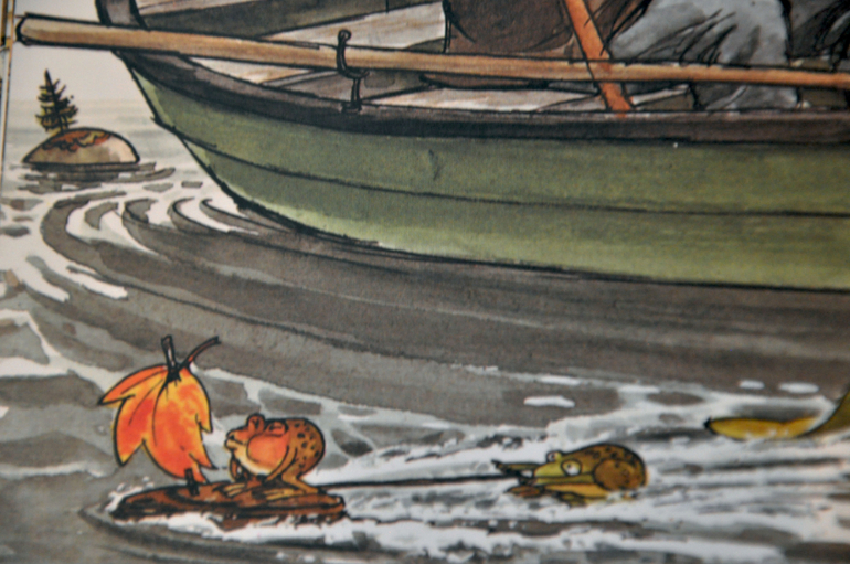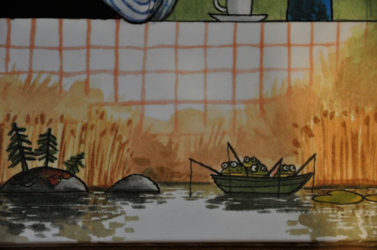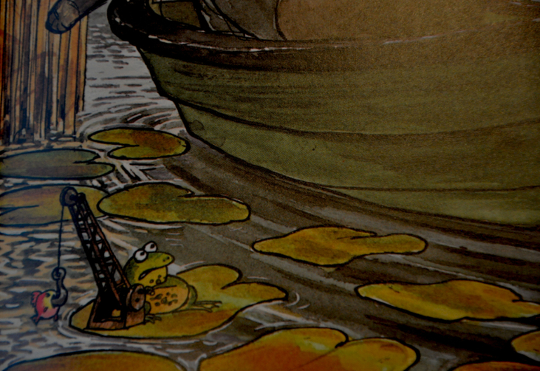 тут извините, фото плохое, но выкладываю, чтоб понятнее было. Финдус разыгрался-разфантазировался и чуть не угодил за борт. Петсон его вовремя словил за хвост. Снизу сидит недоуменно глядящая жаба. А на что она рыбу ловит - на кран, конечно, там же тоже крючок)