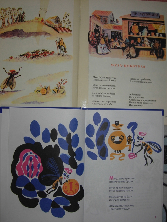 3. Чуковский - в этом месяце у нас несомненные хиты - Муха-цокотуха и Тараканище. Читали Муху из трех разных сборников. Начинала читать несколько раз до этого с рисунками Конашевича, не было интереса у ребенка совсем. Предложила с Митуричем. И ура! Уже почти наизусть Муху знает.