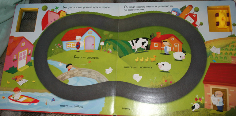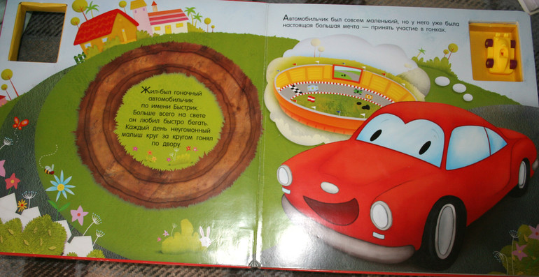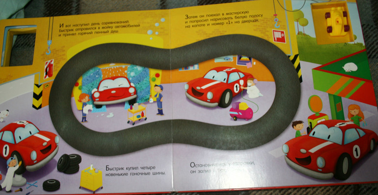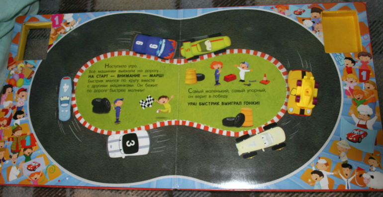 Большая, толстая (но легкая!) книга-игрушка. 12 страничек, 6 разворотов. По первоначальной цене не купила бы никогда в жизни. Но в Ашане их продавали по 10 гривен уже без машинок (добросовестные люди не удержались, чтоб не повыколупывать). Да, в книге есть ячейка для маленькой металлической машинки, которая должна самостоятельно двигаться по магнитной дорожке на каждом развороте. Увидев книгу за десятку, сразу подумала: а что, мои дети не смогут играть с любой другой машинкой по сюжету книги? Так и получилось. В ячейке сразу поселилась маленькая машинка из киндер-сюрприза. Двухлетний сын долго не отходил от книги, даже не было смысла пристраивать ее на полку. И сейчас достает поиграть и почитать.
