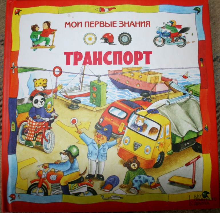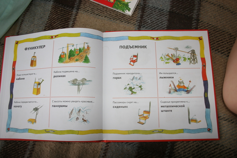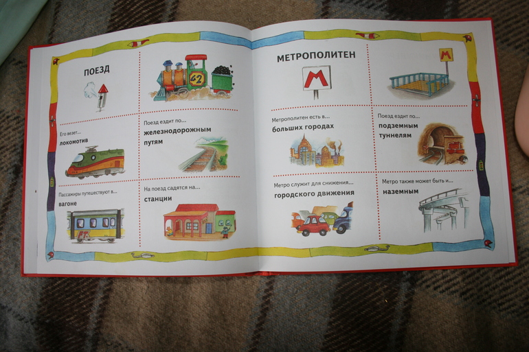 В книге 24 страницы и довольно много видов транспорта - самокаты-велосипеды, автомобили-джипы, воздушный и водный транспорт, фуникулер и другие.