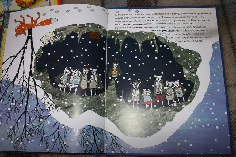 Если почитать отзывы, то книга неоднозначная и даже спорная. Мнения разделились. Вот мне их разделение вообще непонятно. Я отношусь к тем, кто считает такую книгу плюсом в домашней библиотеке. Начну с того, что необычное оформление сразу прельстило ребенка. Даже очаровало. В стиле коллажей, где сочетаются рисунки и фотоизображения. Мыши малышу очень понравились. У него есть любимые персонажи, за которыми он следит на каждом развороте. Следующая (или, даже, первая) необычность книги в том. что ее можно читать и рассматривать в правильном положении и вверх ногами. Ребенок не остался равнодушным к этой изюминке.