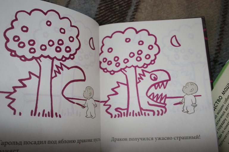 Благодаря ББ по выгодному предложению книга попала к нам. Милейший малыш Гарольд, в ползунках, способен нарисовать все, что угодно. Начиная с дорожки, которая поведет его в мир. Нужен лес? Сад? дерево? Дракон, который будет охранять плоды? Хочется перекусить или найти собственный дом? Домов сколько угодно, но где же родное окно? На все способен малыш и его фиолетовый мелок.