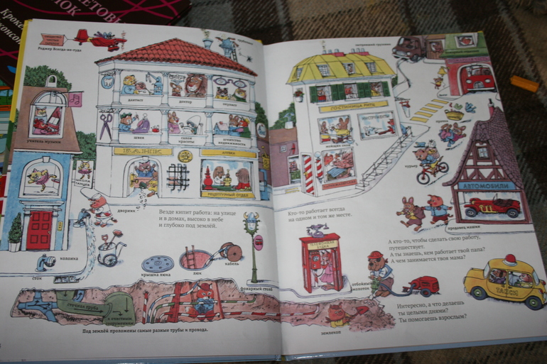 Тем много. Первая - первичный экскурс в профессии и их взаимосвязь(каждый удовлетворяет потребности других людей и наоборот). Далее - строительство дома, тушение пожара, как делают хлеб, как ухаживают за больными в больнице и т.д. И все - с такими чудесными подробностями (как для мальчишки) в виде труб, телефонопровода, электрики и т.д. и т.п. Классно. Классно! КЛАССНО.
