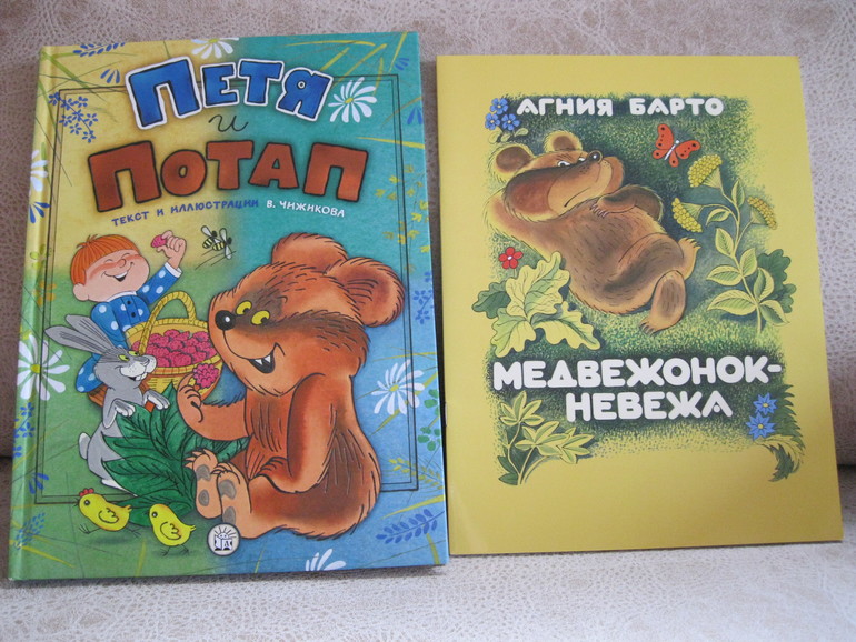 Историю про Петю и Потапа (первую) мы уже читали несколько месяцев назад, но ребенок долго не хотел к ней возвращаться, а тут сказал кодовое "Будем!", и несколько дней книга была снова в ходу. Прочитали про злого охотника, перечитали про Потапа. На этой волне достала книжку «Медвежонок-невежа», которая была отвергнута до этого несколько раз, тоже пошла.