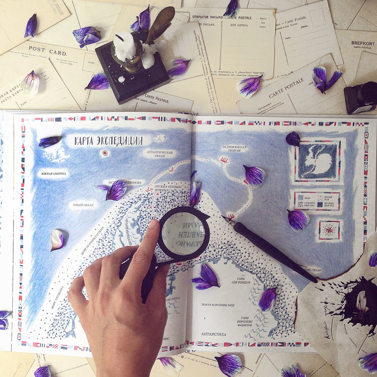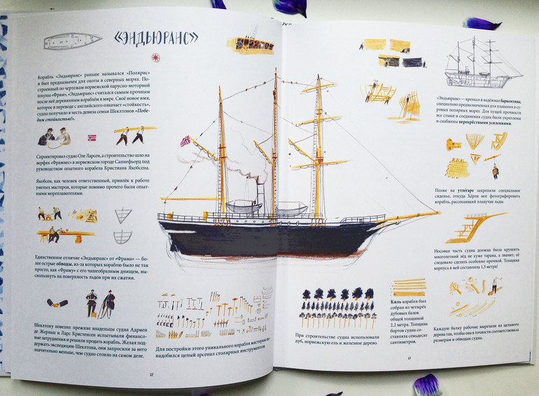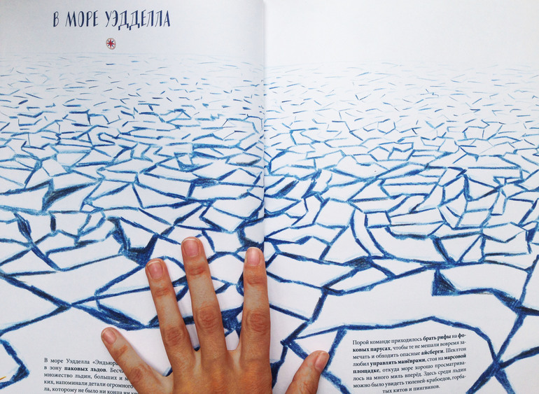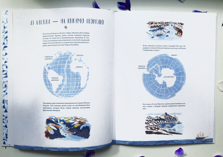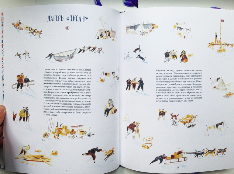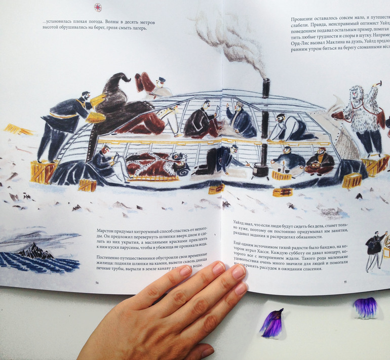 Ну, а дальше каждый разворот - веха в путешествии. Всё подробно описывать я не хочу, чтобы вам было интересно почитать самим. Скажу лишь, что путешественникам пришлось пережить немало приключений: пробиваться на своём судне сквозь лёд, переехать с корабля на дрейфующую огромную льдину и разбить на ней лагерь, наблюдать крушение любимого судна, не выдержавшего ледяных объятий Арктики, охотиться на пингвинов, есть рыбу, найденную непереваренной в брюхе у морского леопарда и многое-многое другое. Долгие месяцы приключений, так ёмко уместившихся в одну детскую книгу.