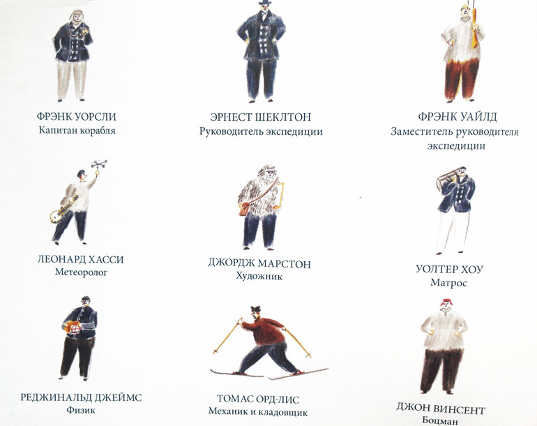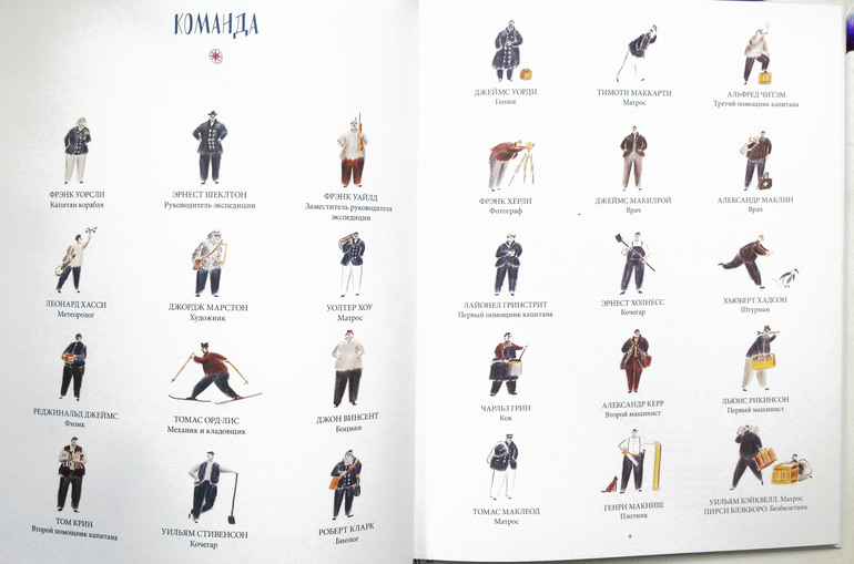 Дальше разворот с полным перечнем команды. К слову, каждый член нарисован иллюстратором в соответсвии со своей профессиональной ролью на судне)