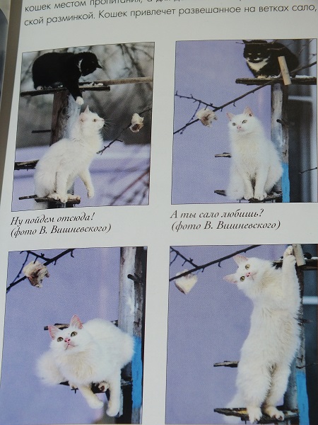 "Посетители кормушек делятся на несунов (хватают семечко и улетают - типично для синиц и поползней) и посидельцев (забираются в кормушки и сидят, жуют). Несунам, конечно, страшно неприятны сидельцы. Несколько раз больше синицы, которые никак не могли дождаться своей очереди у кормежки, демонстрировали военную хитрость. Садятся недалеко от занятного пенька и подают сигнал тревоги, как обычно о ястребе предупреждает. Все остальные птицы мгновенно отлетают, а синицы берут свой корм".