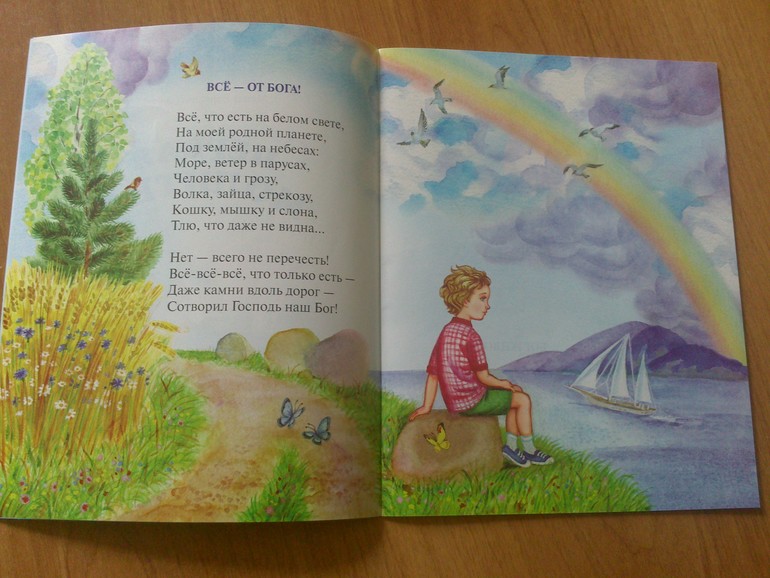 Сначала про иллюстрации)))Они такие нежные,душевные,добрые...и очень соответствуют настроению книги.Можно подумать,что автор стихов и иллюстратор это один и тот же человек,настолько они хорошо сочетаются друг с другом.Стихи просты и наивны,словно написаны ребёнком;автор передал в них всю любовь свою к Господу,к жизни,ко всему,что есть на свете.