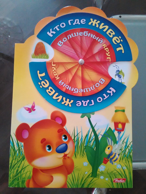 Еще мы купили книжку с заданиями, на лицевой стороне круг, который Юле очень понравился. Можно узнать кто где живет, если его покрутить)))