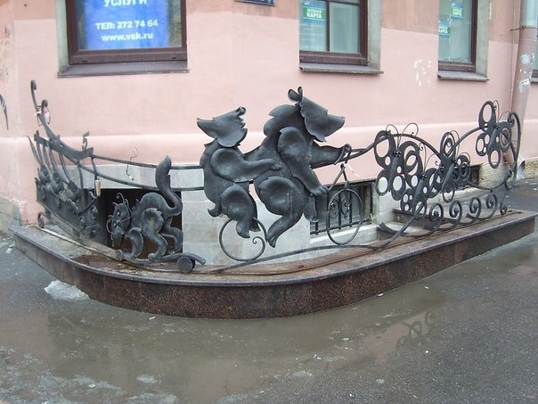В Санкт-Петербурге у дома возле Спасо-Преображенского собора (Манежный переулок дом 6) есть забавная кованая решетка - иллюстрация к детскому стихотворению "Тараканище" К. И. Чуковского. На решетке и медведи, которые ехали на велосипеде, и кот задом наперед едет на какой-то помеси тележки с самокатом, и зайчики в трамвайчике (почему-то трамвай именно с номером 5).