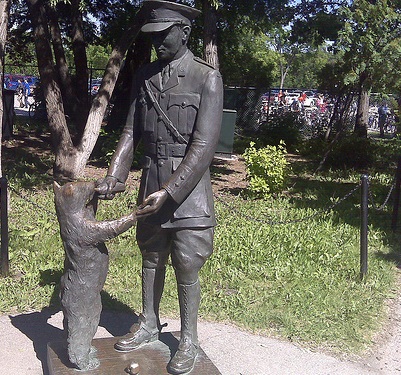Интересно, что на территории зоопарка есть еще один памятник Винни. Там героиня изображена в виде маленького медвежонка вместе с врачом-ветеринаром лейтенантом Гарри Колборном, талисманом которого являлась при жизни.