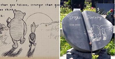 На могиле Бориса Заходера скульптор Андрей Налич изваял земное полушарие, разрезанное в виде двух книжных страниц. На одной странице - факсимиле подписи Заходера, на другой, известный рисунок Эдварда Шепарда, которым заканчивалась первое издание книги Алана Милна: Винни- Пух и Пятачок, уходящие по дороге вдаль навстречу заходящему солнцу.