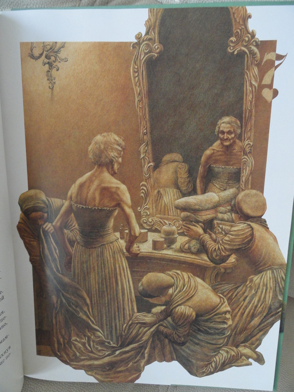 Книга очень большая, не пойму зачем такой формат. Иллюстрации не плохие, но что-то мне в них не хватило, не "заработали" они в паре с тестом. Единственная боле-менее сильная иллюстрация со старухой у зеркала.