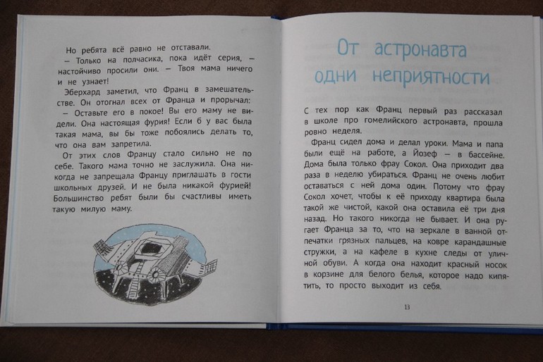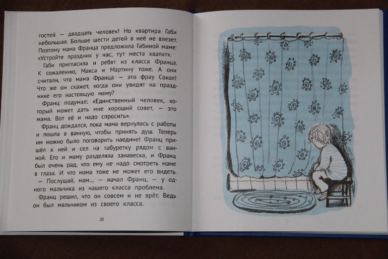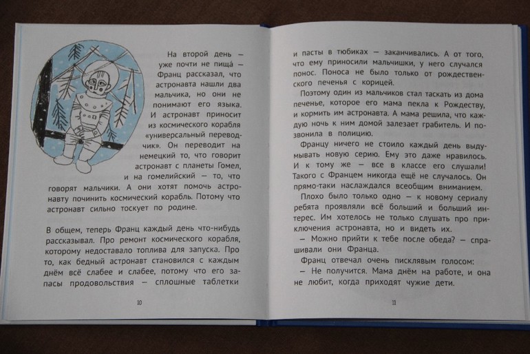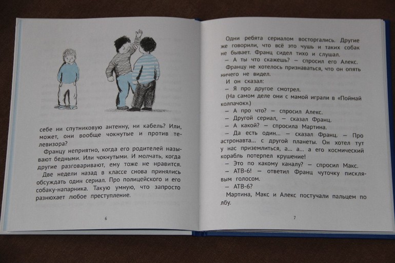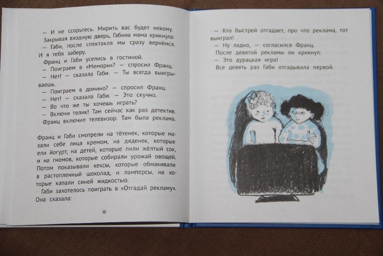 Читается книжка легко, язык простой и понятный, да и проблема Франца многим знакома. Смело меняйте в рассказе слово "телевизор" на компьютер, крутой телефон, скейт, ролики или еще какую-нибудь модную и навороченную вещь, которой не обладает ваш ребенок и пожалуйста - он скорей всего оказывается в подобной ситуации. У всех есть, а у него нет, все обсуждают, а он стоит в сторонке. К сожалению, современным детям, чтобы не чувствовать себя изгоем в своем окружении, нужно обладать неким набором электронных гаджетов, знать самых популярных героев комиксов или мультсериалов. И каждый ребенок в той или иной мере вынужден решать какой модели поведения придерживаться - сочинять, вовлекать в свое, клянчить у родителей покупку и т.д. В историях про Франца ситуации всегда очень жизненные, а потому дети их любят и читают с удовольствием. А мы с сыном как всегда ждем продолжения. Было интересно, но мало ))