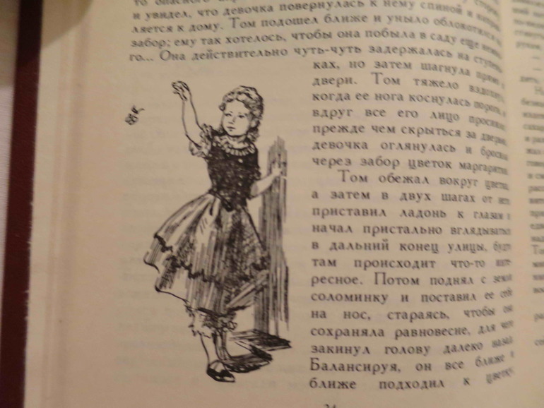 В начальных классах просили всем классом учительницу прочесть нам книгу про Тома Сойера, которую принесла в школу одноклассница. Но та (учительница) заявила, что нам рано читать такие книги!... Поэтому знакомство с книгой состоялось позже, в 5 классе взяла у подружки почитать. Запомнились илл.-и, поэтому именно с ними и выбрала книгу: