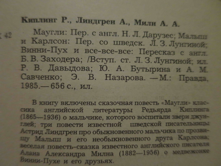 Заказ был сделан 6 июля, получен 6 августа, итого: 24 раб. дня. На сайте: 15 - 20 р.д. Но, ранее по телефону мне было сообщено, что заказ будет чуть позже, т.к. книга с 3 повестями находится где-то дальше остальных... В заказе 3 книги из букинистики (верх. ряд). Всё пришло в том состоянии, как указано на сайте: от хорошего до отличного. И "Азбука" новенькая) Как было упаковано: новый "Винни" в слюде, старый в целоф. пакете. Затем все 4 книги в пузырчатом пакете, сверху картон со скотчем, всё это в пластик. пакете. За пересылку: 5 евро (2 кг).