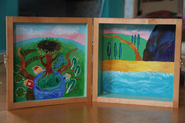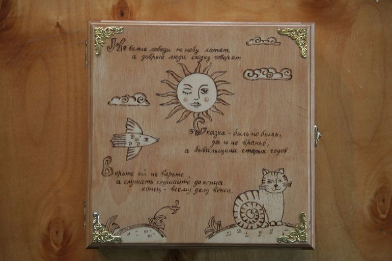 К шкатулке прилагается льняной мешочек, где хранятся несколько камушков и ракушек, а также гнездо для птиц и другие герои сказки. Туда же можно положить и свои находки.
