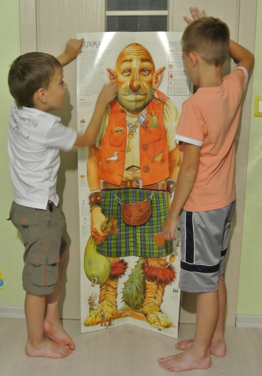 Гигантская книга о великанах - давно не брал в руки:)). А тут исключительно из-за самой фигуры великана вытащил. Все сожалел, что нельзя этого "красавчика" повесить на стену в детской, сестра живо с ним рассправится... А высоко вешать - если только под потолок, т.к. фигура гигантская. Да и потом интересно порой заглядывать в карман да уши этого великана:))).
