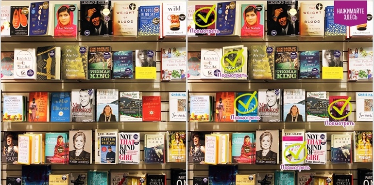 Нужно найти пять разных книжек?)) 1. Верхняя полка вторая книжка слева (та, что с красными кедами); 2. вторая полка сверху третья книжка слева; 3. третья полка сверху третья книга слева; 4. третья полка сверху вторая книга справа; 5. четвертая полка сверху четвертая книга справа