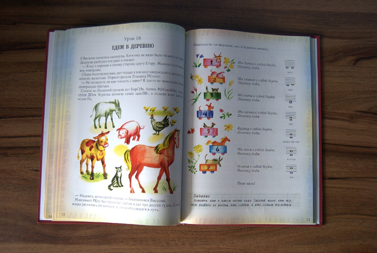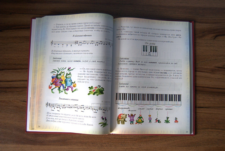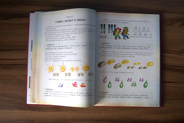 Сложность уроков постепенно возрастает. Мы еще только самые начинающие ученики, но все же движемся потихоньку по сказочному миру музыки. Для занятий предполагается начальное музыкальное образование у родителей или тех, кто будет заниматься с ребенком. У нас его нет, но, к счастью, оно есть, и даже профессиональное, у моей взрослой племянницы, которая помогает нам избежать ошибок и согласилась взять на себя дальнейшие более сложные уроки.