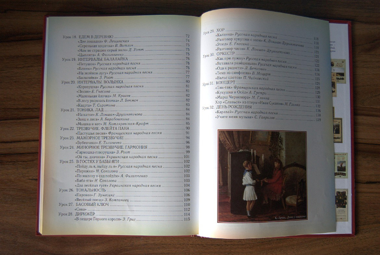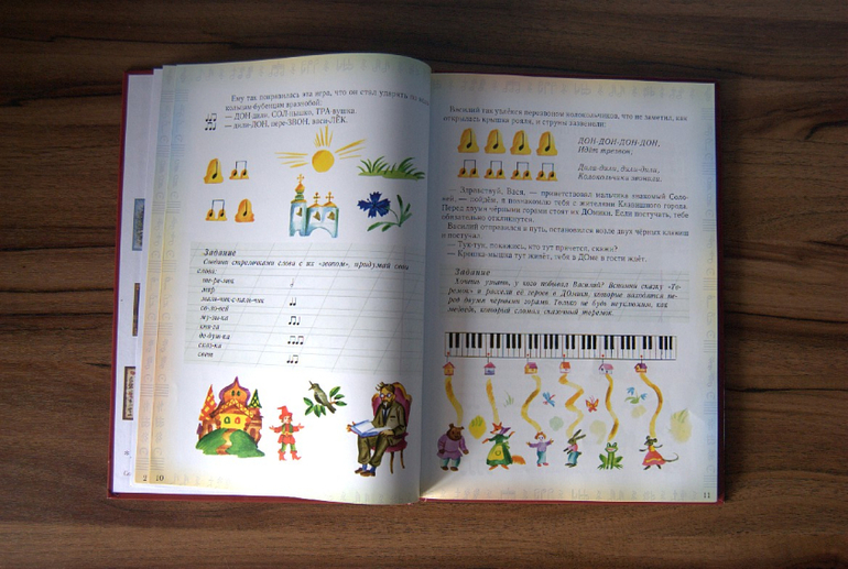 Книга поделена на уроки. В каждом уроке есть и интересная информация (жирным курсивом в красивых рамочках), и непосредственно новый материал, преподнесенный в увлекательной игровой форме, и задания для ребенка (на тетрадном фоне в косую полоску). Таким образом разбивка информации понятна и наглядна. Издатели советуют, а я присоединяюсь, каждый урок осваивать лишь как следует закрепив предыдущий. Вместе с детьми учится и главный герой сказки - мальчик-с-пальчик Василий, а его Дедушка-профессор рассказывает обо всех музыкальных тонкостях доступным даже для самых маленьких учеников языком.