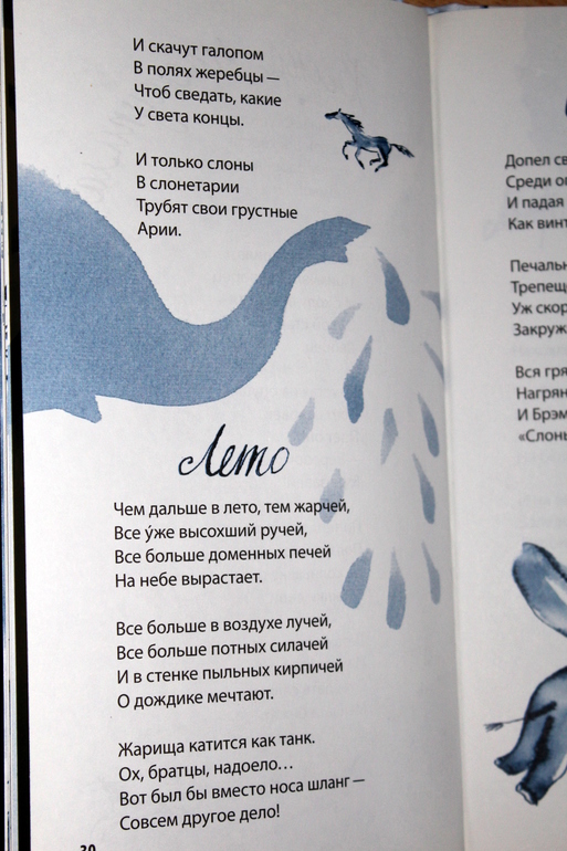 А теперь о книге и стихах. Вся серия хорошего качества. Твердая обложка, довольно плотный офест. Вся книга выдержана в бело-голубых тонах. Название идеальное ей подходит. В стихах много моря и просто воды) А ещё есть небо, звезды, облака, мороз, сочные яблоки и даже рыцари. А ещё, ещё там много юмора! Знаете, мне почему-то даже обидно за Григория Кружкова. Почему его книга самая дешевая из всей серии? Совсем не справедливо.