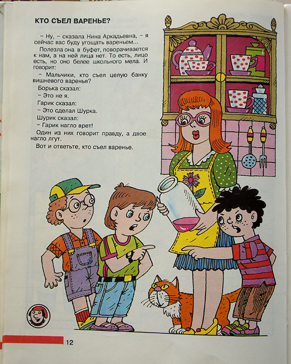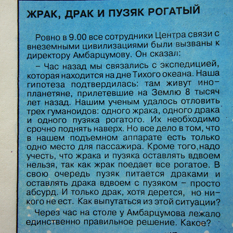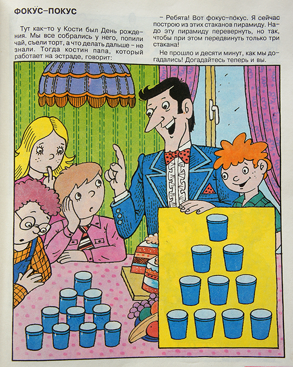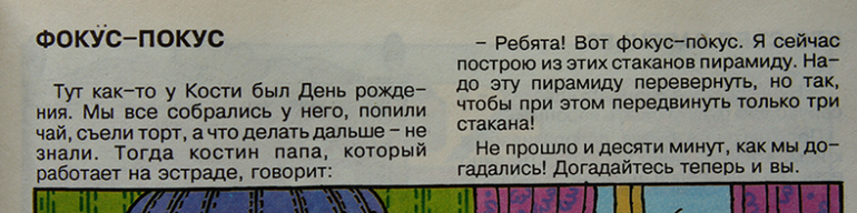 Прикольно! )) Давно задачек для ума не было )) Некоторые - из нашего детства, только переделаны, например, про Жрака, Пузяка и Драка, а у нас была про волка, козу и капусту. А про желток - была задачка в Ябеде-корябеде про перепонную барабанку )) Ушла решать, что-то мне стаканчики не поддаются ))