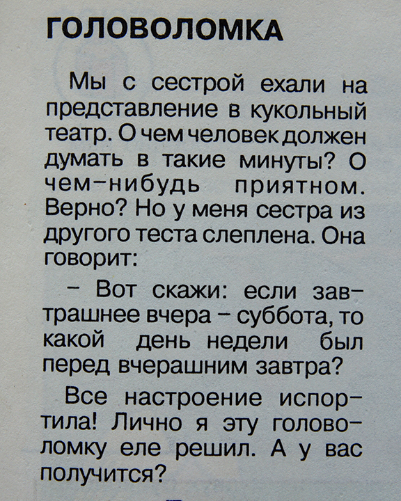 Хнык-хнык, опять не успела(( Только сейчас увидела, но нужно спать уже, дочку рано в садик вести ( да и уверена, что уже многие справились успешно). Пара головоломок пока не подвластны мне)) Остальные вроде "в уме" решились) Спасибо за разминку для ума! Обожаю решать подобные задачки) Ирина, ещё остались? На будущее)) Чтобы не пропустить)