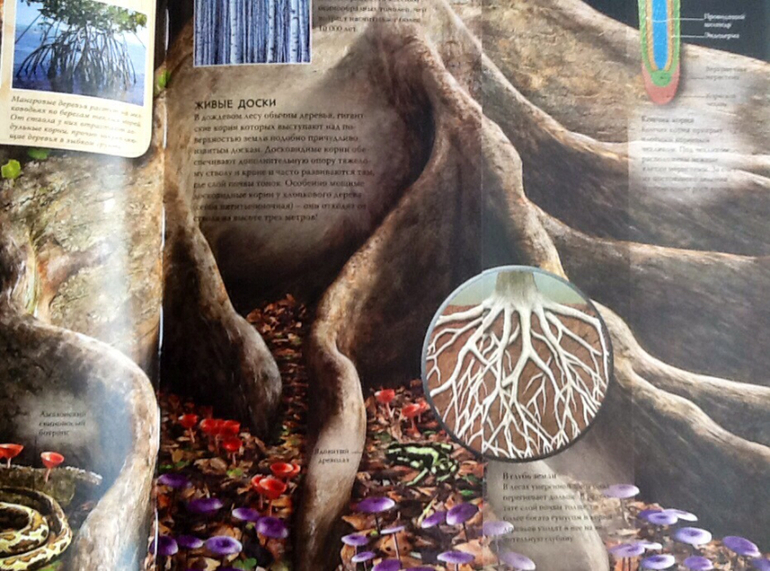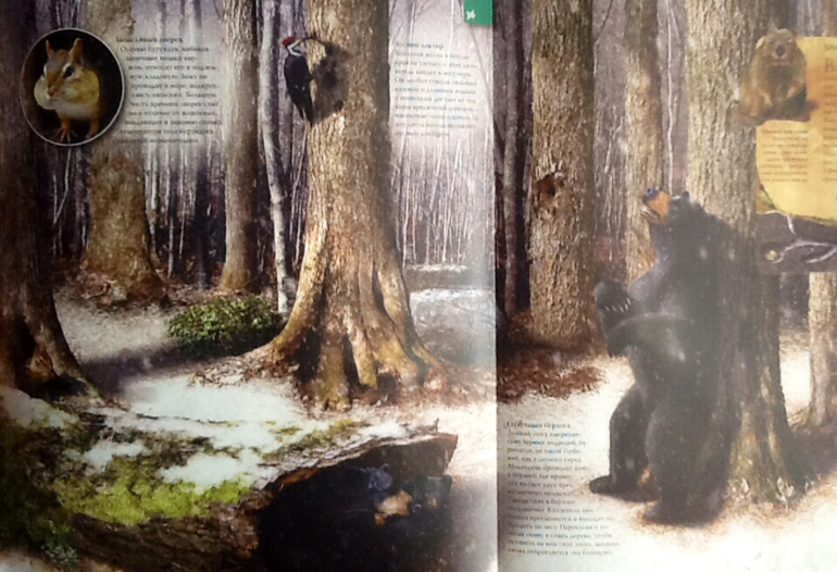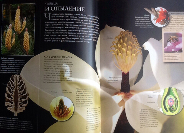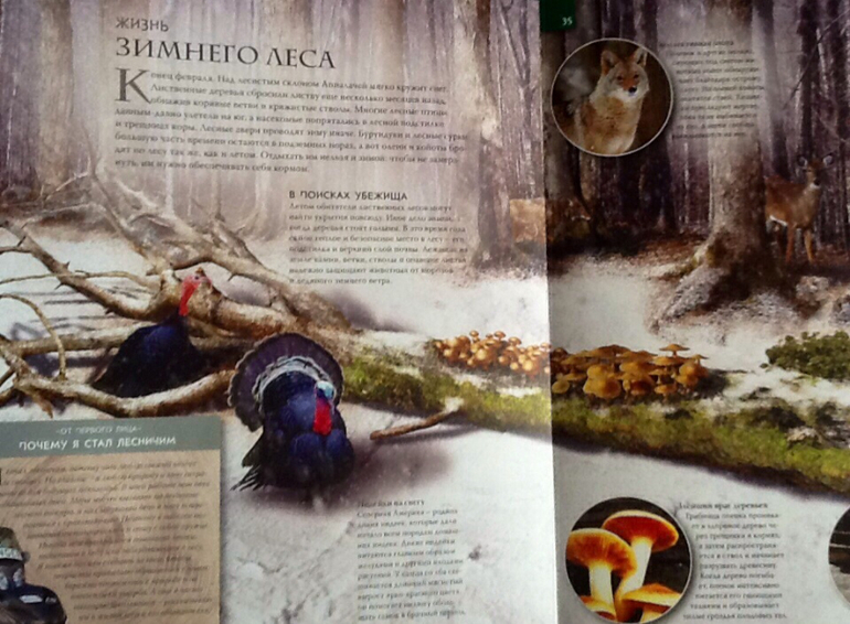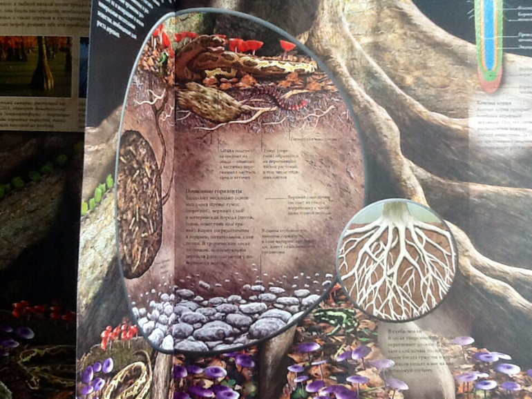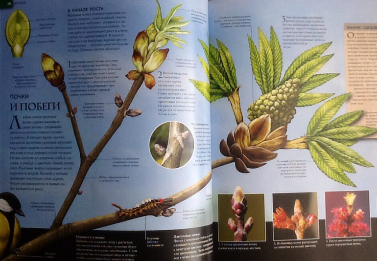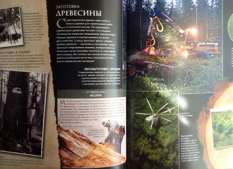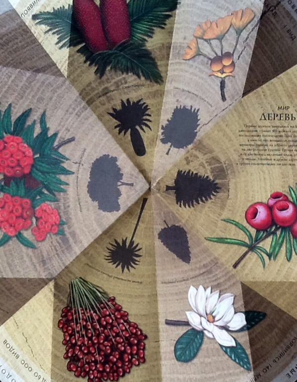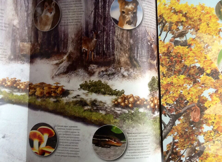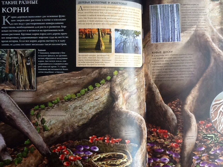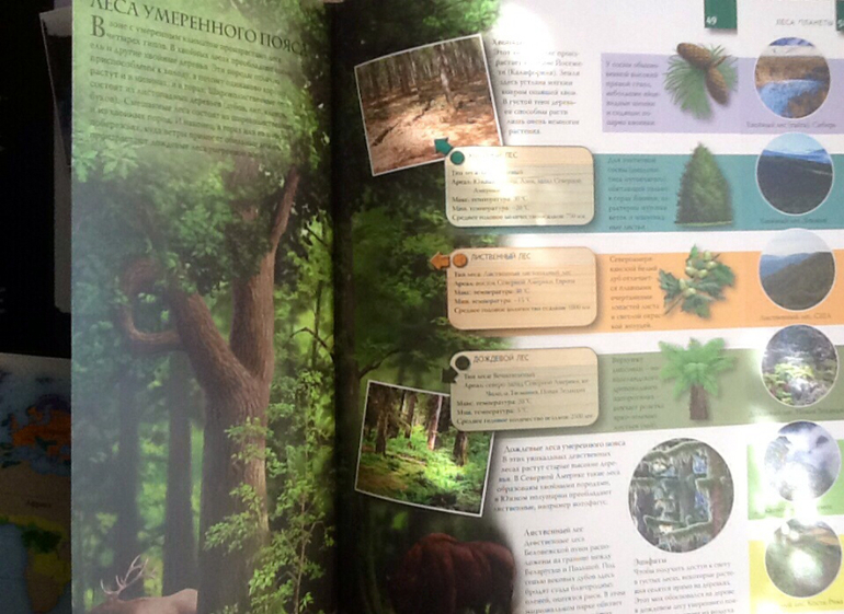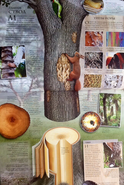 У нас очень много книг о деревьях. Но мимо этой книги я никак не могла пройти. Привлекла меня в первую очередь прекрасная полиграфия. Великолепные иллюстрации, картинки, рисунки и фотографии. А еще и необычные страницы разного формата: ½, ¾ странички. Создается эффект трехмерности. Есть и разворот в 4 странички! Так что интересно не только почитать, но и полистать! И еще диск с игрой викториной в подарок.