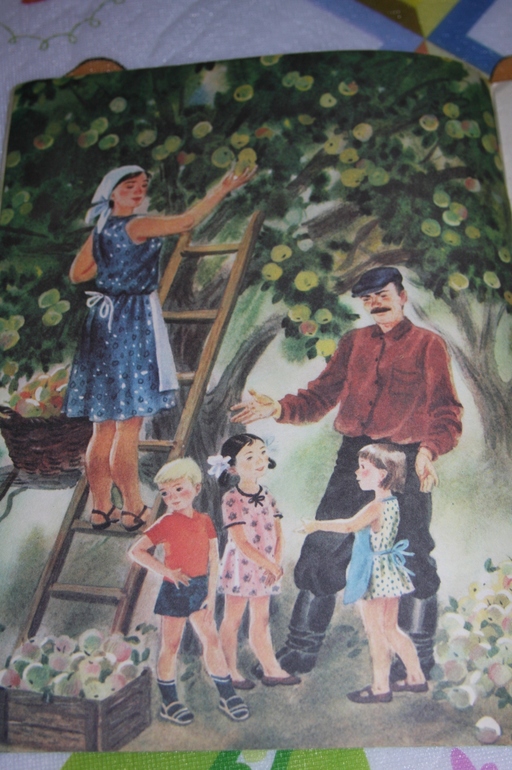 Дальше услужливая память подсказала, что яблок много, например, в "Мешке яблок" у Сутеева, но мы ведь не ищем легких путей?)) Поэтому Сутеева не будет. Будет Ян Райнис с "Дедушкой и яблоньками" аж в двух вариантах. Во втором даже с полосочками)